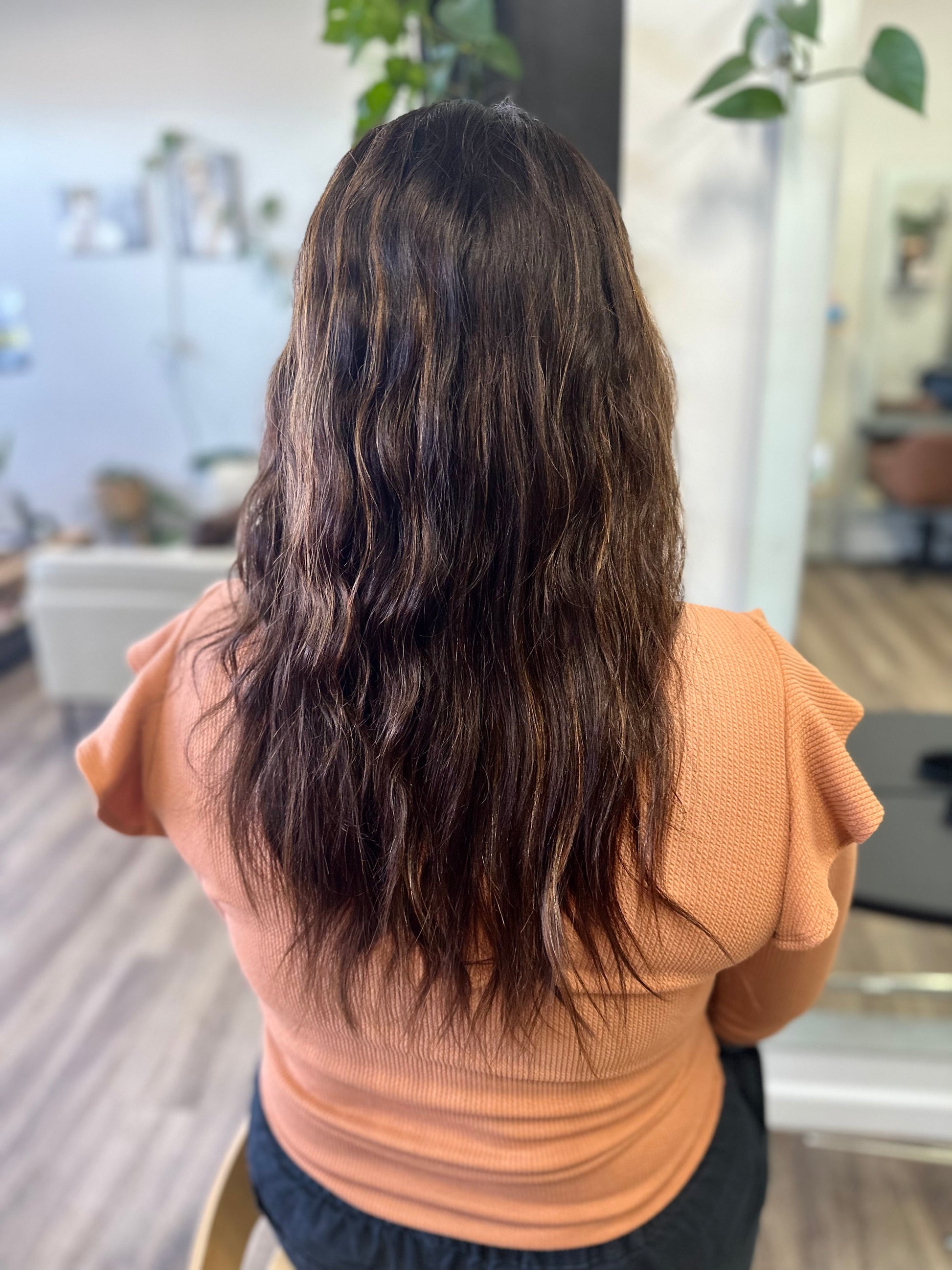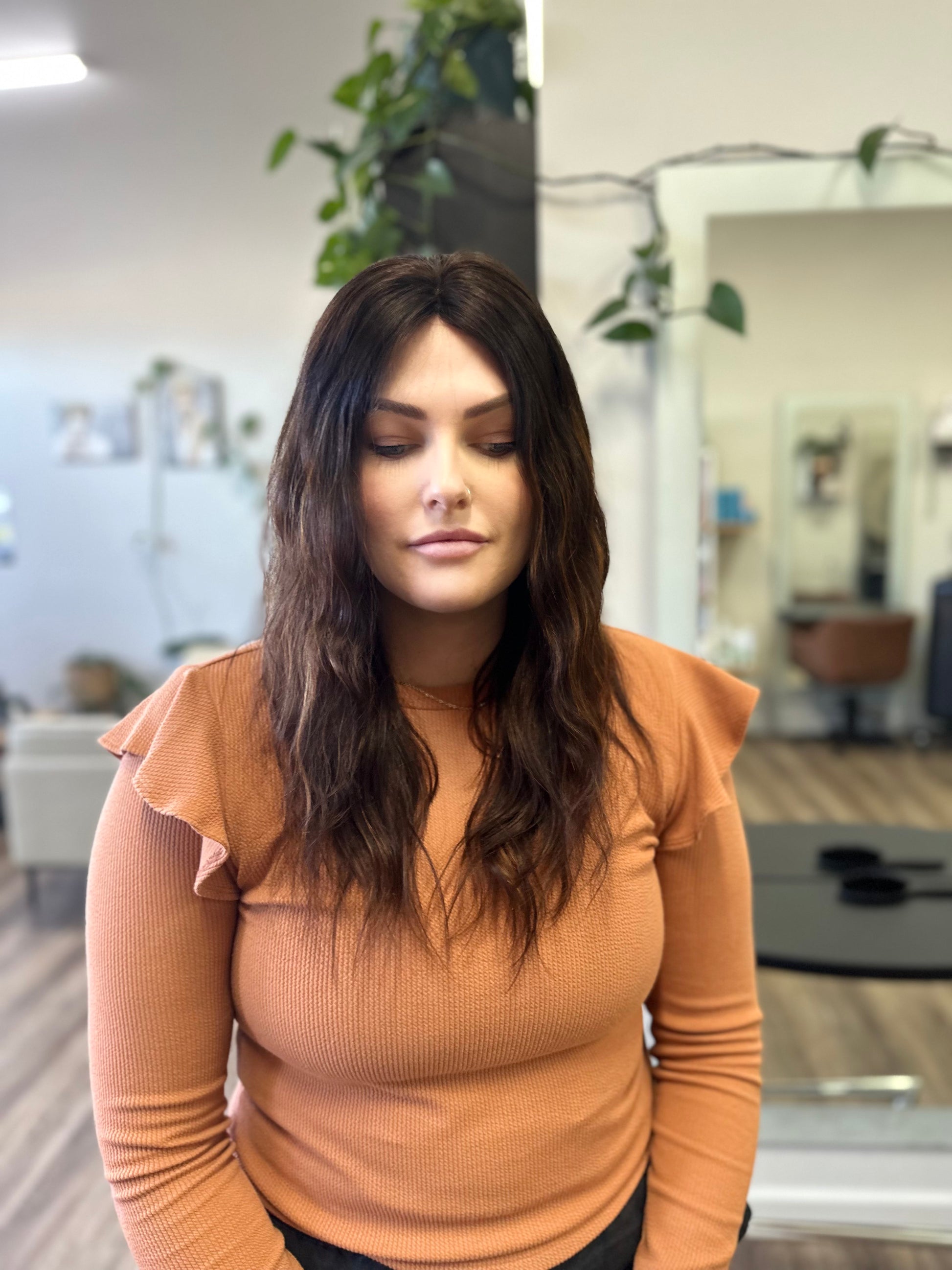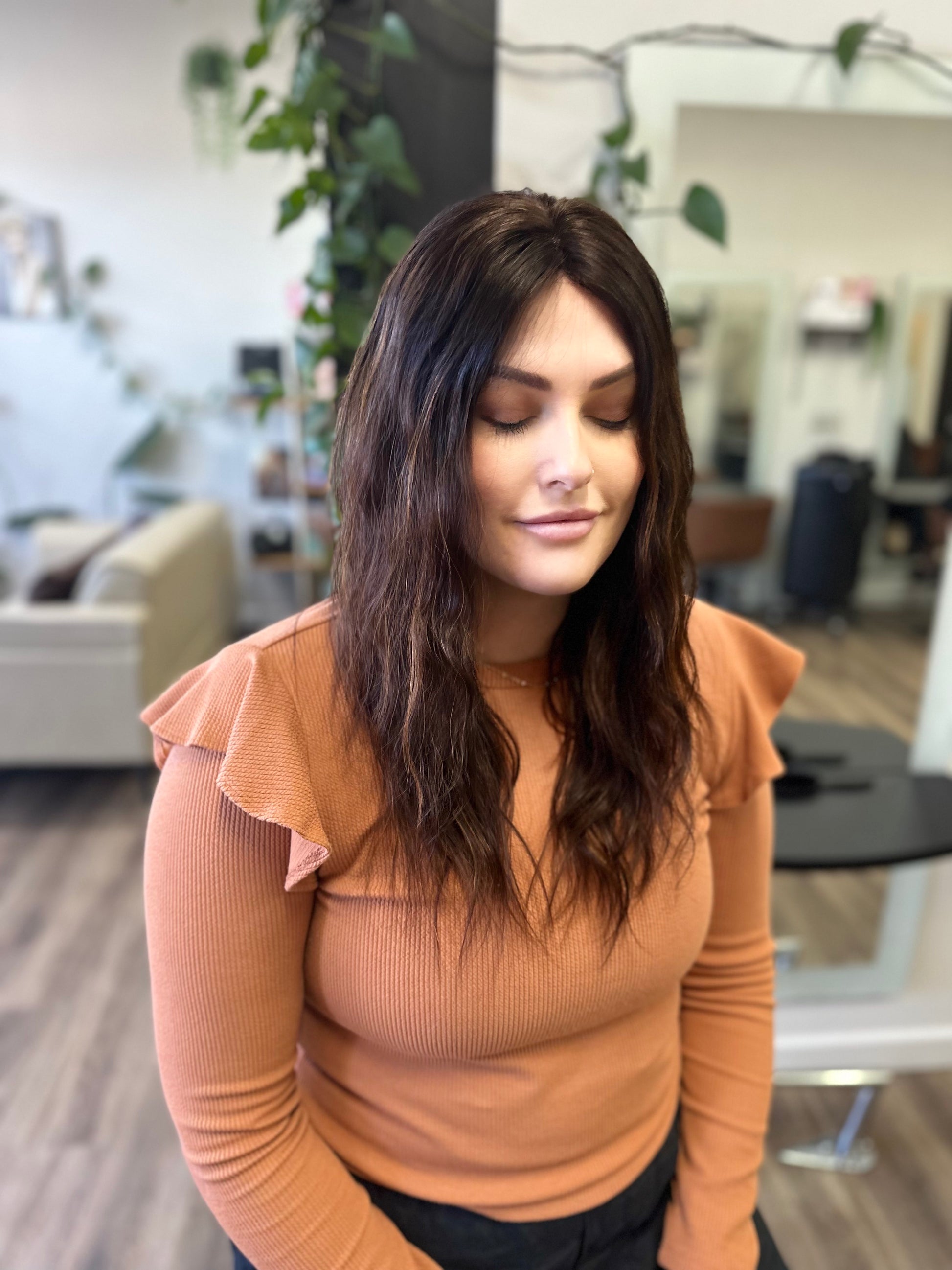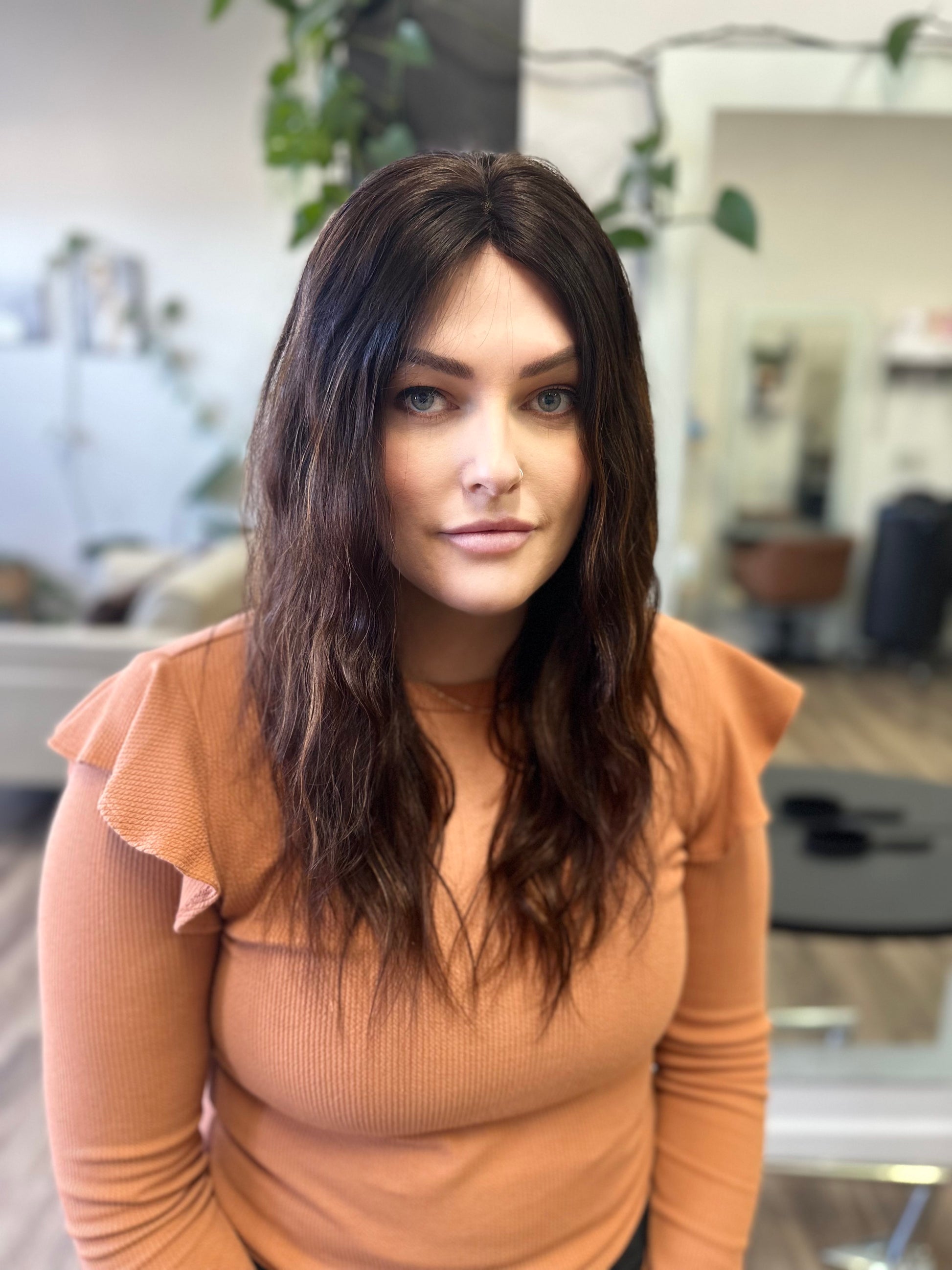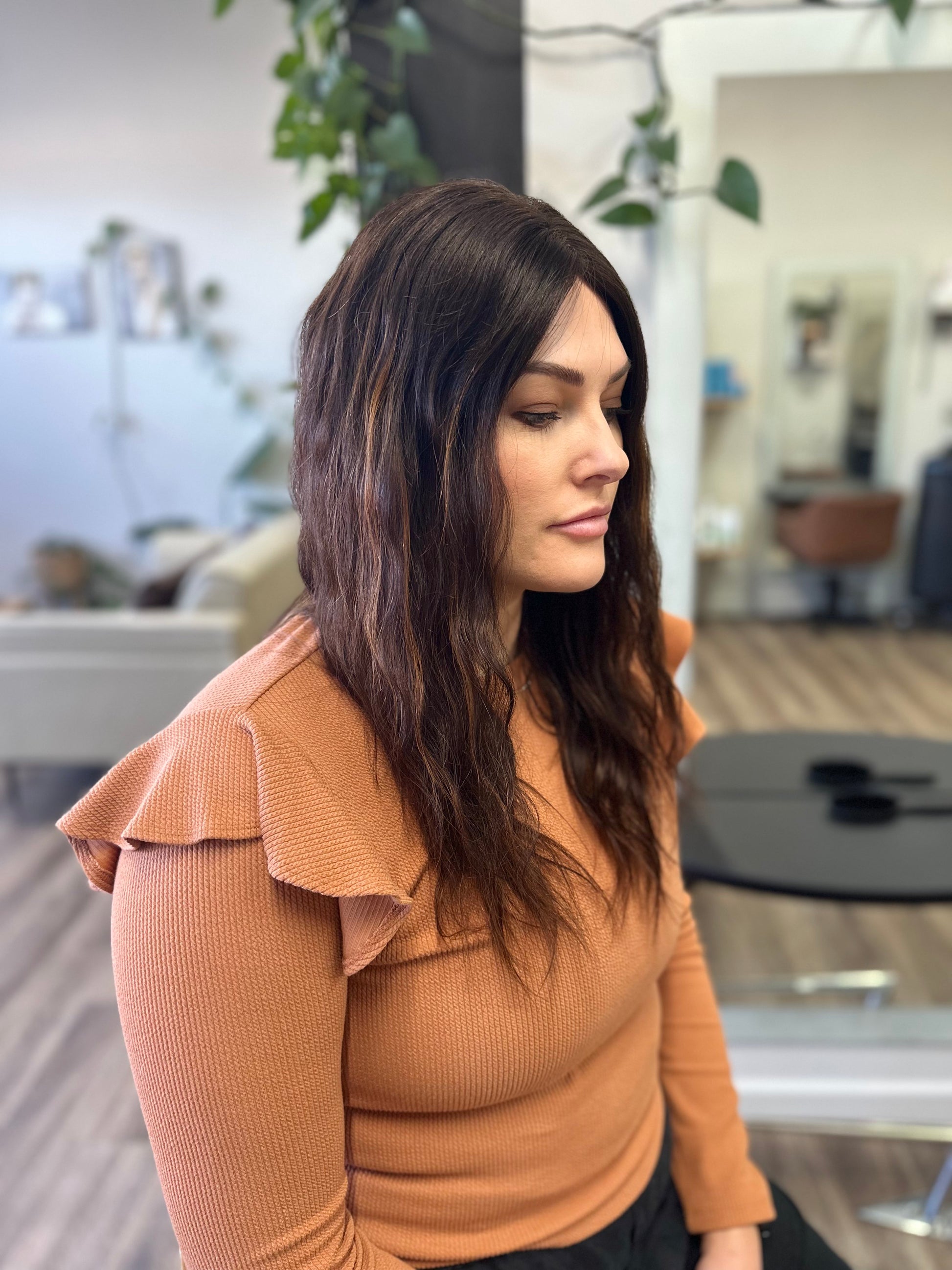Clad in a rich brunette shade with subtle highlights, Sally magnifies the timeless beauty of this classic hue. This depth of colour is crafted using Z.one Concept Milk_shake professional colour, applied by expert stylists with over 25 years of experience, enhancing its allure across diverse skin tones.