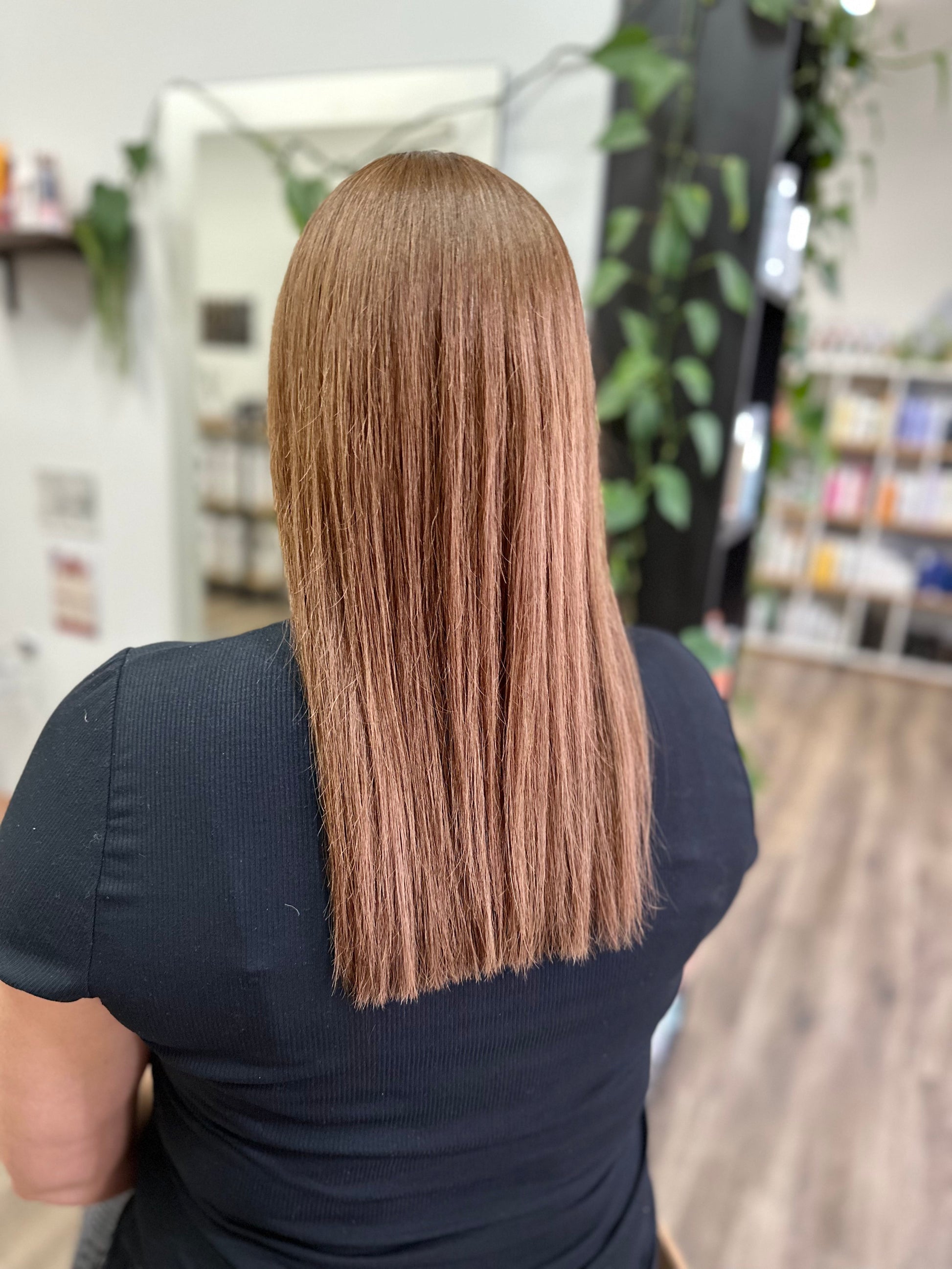 Adorned in a classic rich warm caramel with a natural darker root, Mia is coloured using Z.one Concept Milk_shake professional colour. The nuanced shades have been applied by an expert stylist with over 25 years of experience, lending each strand richness and vibrancy, making it a perfectly elegant addition to any ensemble.